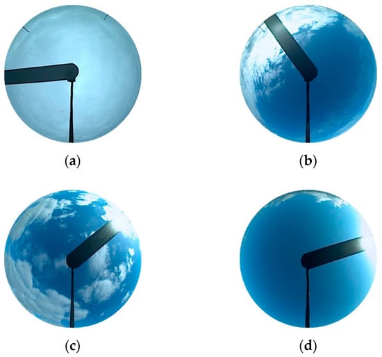 Depending on the state of the clouds and sun, the images were divided into four categories, as shown in Figure 8. The first category of overcast sky is shown in Figure 8a where the sun was not observed and the sky was generally covered by clouds. The second type is cloudy without sun, shown in Figure 8b, where there were both clouds and clear skies, but the sun was blocked by the clouds. Figure 8c shows an image with clouds and clear skies that was placed in the cloudy with sun category because of the visible sun. The final category is that of clear sky, as shown in Figure 8d, where the sun was extremely clear and few clouds appeared