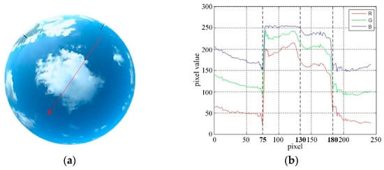 To distinguish clouds and clear skies, the channels were analyzed. The RGB values are separately extracted along the red stripe in Figure 8a, and the distribution of the values representing the clouds and clear skies is presented in Figure 8b. The clear sky pixels were distinctly observed at 0–75 and 180–240, and cloud pixels were distributed in the 75–180 range. Bright cloud pixels were mainly distributed at 75–130, and dark cloud pixels were distributed over 130–180. It can be clearly observed that the two kind of clouds differed in that the channel value of the bright cloud pixels was larger than that of the dark cloud pixels. It is important to mention that the blue component of the bright cloud pixels was easily saturated because this component was limited to the range of 0–255. Of course, it is also possible that all three channels were saturated. It can be observed that the blue component was greater than the green component and the red component and the values of the cloud pixels were higher than those of clear sky pixels in each color component.