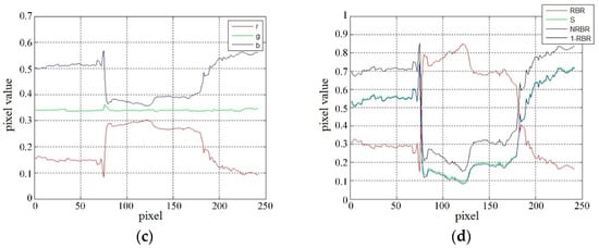 To numerically understand the three features, the feature values on the red stripe in Figure 8a are plotted in Figure 9d. The trends of the three features were observed to be similar. The results of RBR and NRBR were fully compatible with the relationship shown in Figure 10b. Compared to RBR, although the nonlinear compression of NRBR reduced noise, it was prone to reduce the contrast between clouds and clear skies. The consistency of the chromaticity coordinate function of S with the approximation function of NRBR was verified. The analysis showed that RBR and NRBR measured the difference between r and b, and S and NRBR were regarded as the measures of r. The measure of the difference between r and g can obtain similar results. Thus, the ARGD feature was proposed. ARGD was not only consistent with the theory, but also corrected the blue component saturation. The computational cost was minimized, and the adjustable weight was highly suitable for cloud detection considering the interference of sunlight.