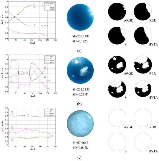 The numerical analysis of RBR, S, NRBR, and ARGD and image comparison of the corresponding algorithms are illustrated under different sky conditions (Figure 11). A linear histogram was plotted to analyze the performance of the pixels on the red line in the sky image under different features in detail. For better observation, ARGD was displayed in normalized form. Figure 11a shows the experimental results for a clear sky. It is observed from the linear histogram that cloud pixels were identified from 0 to 58 to RBR with the fixed threshold, and from 0 to 49 to S with the fixed threshold. Since the influence of sunlight caused the sky standard deviation to be large, the HYTA algorithm used the MCE adaptive threshold (0.529) on the NRBR, and clouds were identified from 0 to 67. The values of ARGD were negative for the entire red line, correctly identifying the clear-sky pixels at zero threshold. The misrecognition of other features in cloud pixels was considered to be caused by the interference of sunlight. Two parameters, namely SI and SD, were calculated to determine the sky state. The SI indicates that the brightness of the sun was high, so the sun appeared in the image. The SD indicates that the sky saturation was unevenly distributed, so the image was disturbed by sunlight. At this time, different layers had different weights. The performances of the four algorithms were also shown and it was observed that RBR detected more clouds than S, but fewer than HYTA, while ARGD reduced most of the interference of sunlight and showed excellent performance.