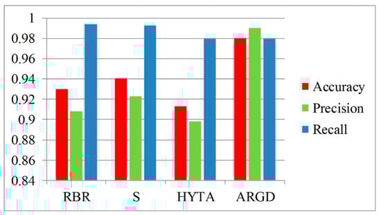 Compared to other algorithms, ARGD had the highest accuracy of 98.02%, and moreover, the recall and precision were the most balanced. Although the recall rate of 99.02% was the lowest, it was not much different from the recall values of the other algorithms. Overall, ARGD obtained outstanding detection results. The outstanding performance was due to the weakening of the effect of sunlight, demonstrating that interference by sunlight was the difficulty that must be overcome to obtain improved accuracy. In summary, ARGD reduced the interference of sunlight and achieved better performance. Therefore, it is the most promising approach.