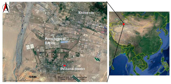 The sampling site was on the rooftop of a residential building in Dushanzi district, Xinjiang (north latitude 44°19’43″, east longitude 84°53’0″). The building is about 25 m above the ground and is taller than its surroundings. The petrochemical industrial area is to the northwest of the sampling site, and Quitun city is to the north (Figure 1). The sampling site is surrounded by residential buildings, commercial streets, and major roads. Therefore, the sampling site is representative of a mixed-use functional area in the Dushanzi district integrating residential, traffic, and industrial impacts. The campaign was conducted during the non-heating (14 to 19 September 2015, n = 21), heating (10 to 16 December 2015, n = 21), and sandstorm (19 to 24 April 2016, n = 19) periods, respectively. One-hour VOC sampling (based on US EPA TO-14) was conducted using 2-L stainless-steel canisters three times a day (9:30–10:30, 14:30–15:30, and 22:30–23:30). The interior surfaces of the canisters were passivated. Each canister was cleaned five times using a high-purity nitrogen gas and evacuated. After that, one of ten canisters was selected and filled with nitrogen for 24 h, and then analyzed to ensure that the target compounds were not detected. During sampling, a filter was added at the front end of the pipeline to prevent particles from entering into canisters. To avoid contamination, the pressure in each canister was about 30 psi with an oil-free pump at the completion of each sampling. After the sampling, the samples were stored at room temperature and sent to the lab for analysis after a month.