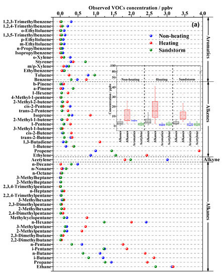 The (a) observed concentrations and (b) initial concentrations of 57 volatile organic compounds (VOCs) during the non-heating, heating, and sandstorm periods. The inset illustrations represent the observed and initial concentrations of alkenes, alkanes, aromatics, and alkynes during the three sampling periods.