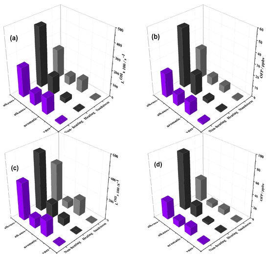 In this study, a total of 57 VOCs were measured including 25 alkanes, 17 alkenes, 14 aromatics, and 1 alkyne. The observed and initial concentrations of the VOCs are shown in Figure 2. The observed concentrations of the total VOCs (TVOCs) were 22.35 ± 17.60, 33.20 ± 34.15, and 17.05 ± 13.61 ppbv in non-heating, heating, and sandstorm periods, respectively. The initial concentrations of the TVOCs were 31.94 ± 12.20, 34.51 ± 22.60, and 21.48 ± 10.66 ppbv in the non-heating, heating, and sandstorm periods, respectively, which are higher than the observed concentrations by ~18%. Both observed and initial levels of TVOCs were the highest in the heating period. This situation was mainly due to meteorological factors, especially wind speed. The average wind speeds were 2.5, 1.4, and 3.7 m/s, respectively, during the non-heating, heating, and sandstorm periods. High wind speed during the non-heating and sandstorm periods lowered the concentrations of pollutants, while low wind speed during the heating period led to pollutant accumulation [21]. The concentrations of aromatics were the highest in the non-heating period and the lowest in the heating period, likely due to high humidity and low temperatures in the heating period, facilitating the chemical transformation of aromatics from a gas phase to a particle phase [34], and the low temperature was not conducive to volatile aromatics. Low concentrations of aromatics in the sandstorm period were caused by the low temperatures and high wind speeds, which were beneficial to the diffusion of aromatics.