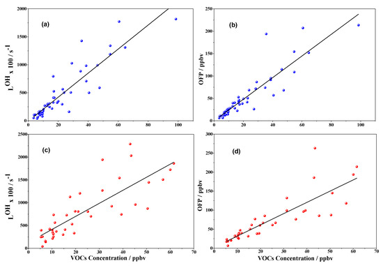 The relationship between the total LOH/OFP and TVOCs of the (a,b) observed and (c,d) initial VOCs for the sampling periods.