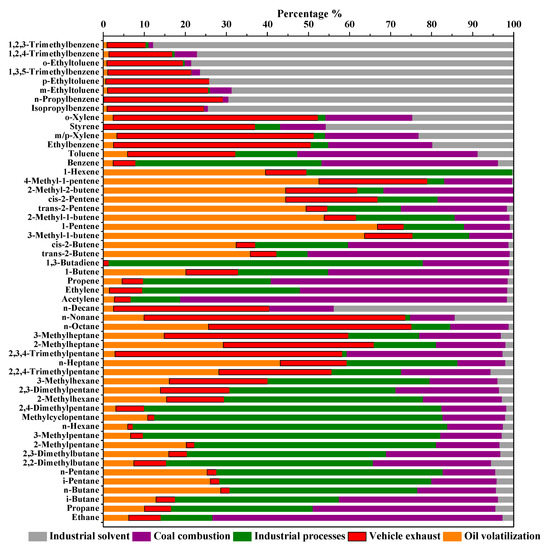 Source 4 was characterized by high fractions of ethane, propane, i-butane, acetylene, ethylene, 1-butene, trans-2-butene, and benzene. Acetylene is a typical product of incomplete combustion [49]. Some studies have noted that 1-butene is an indicator for coal-fired power plants [50,51,52]. C2 species such as ethylene, ethane, and acetylene are abundant in the exhaust of coal combustion [53]. As a typical tracer for coal combustion, sulfur dioxide has the same trend as ethane and acetylene (Figure S1). Thus, source 4 was assigned to coal combustion.