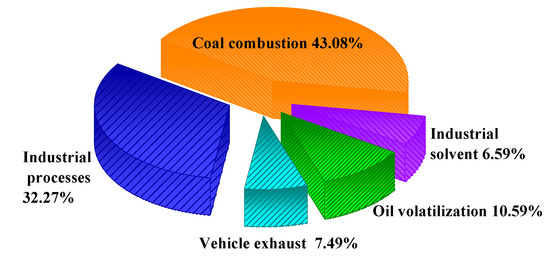 The PMF model was used to attribute the VOC sources in the air of Dushanzi. Five sources were identified in Dushanzi, including oil volatilization, vehicle exhaust, industrial processes, coal combustion, and industrial solvents (Figure 5).