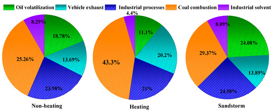 Figure 6 shows the source apportionment of the VOCs via the PMF model. Coal combustion was the most important contributor (43.08%), and industrial processes (including industrial solvent volatilization and industrial process leakages) accounted for 38.86%. Coal combustion is the main source of energy in the Dushanzi district, so it accounts for the largest proportion. Since Dushanzi has a small population and urban size, the contributions of oil volatilization and vehicle exhaust are relatively small. We then analyzed the VOC sources during the non-heating, heating, and sandstorm periods, respectively (Figure S2). We found that the contribution of coal combustion to VOCs during the heating period was much higher than that of during the other sampling periods (Figure 7). This was mainly due to the increase in coal combustion during the winter. At the same time, industrial solvents and oil contributed less to VOCs because of the lower temperatures during the heating period. The contribution of the sources of VOCs during the non-heating period were similar those in the sandstorm period, because the decrease of coal combustion during the non-heating and sandstorm periods and the higher temperatures and wind speeds lead to a significant increase in the volatilization of industrial solvents and oils.