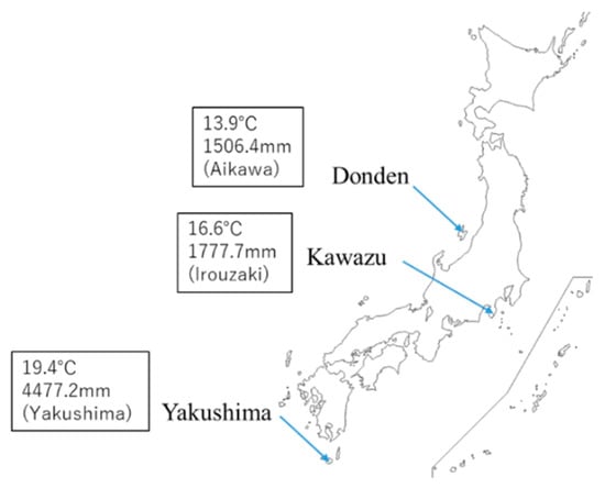 Collected area of the mother trees of three clones. Values in the box represent the annual mean air temperature and precipitation from 1981 to 2010 at the nearest weather station (in parentheses) [].