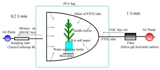 The needle leaves were cut at the experimental facility, quickly supplied with water, and carried to the laboratory within 10 min for measurement of the monoterpene emission rate using the branch enclosure method (Figure 2) [,]. Briefly, a transparent perfluoroalkoxy alkane bag was used for the branch enclosure method (JPBP0610; TGK, Japan, L = 150 mm × W = 250 mm). Cleaned dry air (1 L min−1) filtered by a tank packed with activated carbon and silica gel was supplied to the branch bag through a frame ring (ø 140 mm) made of a polytetrafluoroethylene (PTFE) tube (outer diameter: 6 mm, inner diameter: 4 mm) with holes (ø 1.5 mm) and PTFE connectors (30-6UT-C; Flowell, Japan). The flow rates were controlled using a pump with a mass flow sensor (inlet side: MP-Σ100H, 1.0 L min−1, outlet side: MP-Σ30N, 0.2 L min−1; Sibata, Japan) equipped with an AC adapter. The overflow rate of the branch bag was 0.8 L min−1. The inside air temperatures of the branch bag were monitored using a thermistor (TR-52; T&D, Japan). In the laboratory, we cooled the needle samples in the dark in an incubator (PU-3KT; Espec, Japan) at 5 °C for 60 min to stabilize the monoterpene emission rate before measurement. Then, the air temperature in the incubator was increased in 5 ℃ increments between 5 and 30 °C. The monoterpenes in the sampling air of the outlet side of the bag (0.2 L min−1) were collected into a sampling tube for 10 min. For the sampling tube, a stainless-steel tube with an outer diameter of 1/4 in. and a length of 90 mm was filled with Carbotrap B (100 mg) and Tenax TA (200 mg) which were divided into two layers. The sampling tubes were preconditioned at 280 °C for 20 min to remove BVOCs and had been stored before measurement at approximately 5 °C in the dark in a refrigerator.