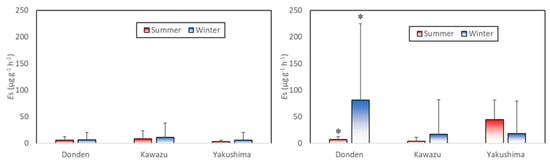 Comparison of the mean basal emission rate () for the control (left) and ozone exposure (right) groups between the summer and winter. Error bars indicate the SD. Asterisk (*) indicates statistical differences (). The value of of Donden in the ozone exposure group in the winter was significantly higher than that in the summer ().