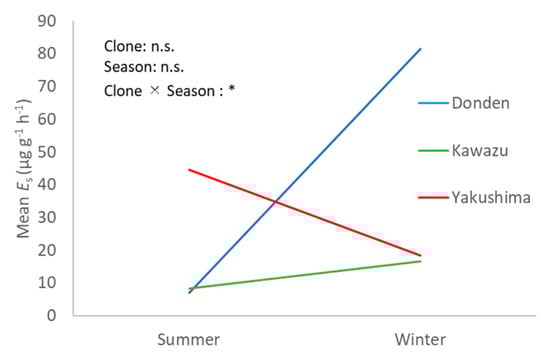 Interaction between seasons and clones in the ozone exposure group. The results of the two-way ANOVA are shown in the upper left area. Asterisk (*) indicates statistical differences (). n.s., not significant. The interaction between clone and season was significant, which suggests that that there was different seasonal change in each clone after ozone exposure.