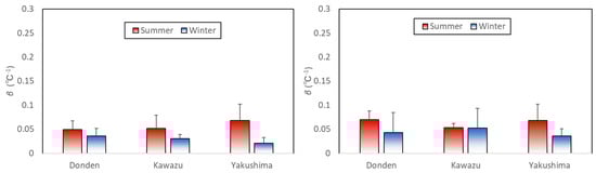 Figure 5 shows a comparison of the mean coefficient -values for the ozone exposure group between the plots. Coefficient is a parameter that reflects an increase in the rate of monoterpene emission owing to a temperature increase. The -values for the control group in the winter for Donden, Kawazu, and Yakushima were 0.036 ± 0.016, 0.030 ± 0.008, and 0.021 ± 0.012 (℃−1, mean ± SD), respectively. There was no statistically significant difference; however, these mean values were slightly higher than those in the summer []. The -values in the ozone exposure group in the winter for Donden, Kawazu, and Yakushima were 0.043 ± 0.042, 0.052 ± 0.041, and 0.106 ± 0.178 (℃−1, mean ± SD), respectively. There was also no statistically significant difference; however, the mean -value in the ozone exposure group was higher than that in the summer, except for Kawazu [].