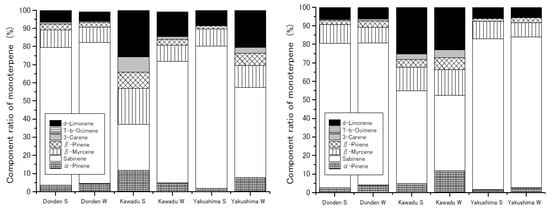 The weighted average composition ratios for the monoterpenes in each clone in the six plots at 30 °C are shown in Figure 6. It has been reported that the composition does not significantly change with ozone exposure in the summer, except for Kawazu []. In the control group, seasonal variations in the composition of Kawazu was high. However, in the ozone exposure group, there was a little difference in composition between summer and winter. Potentially, the composition may have seasonal variations; however, the composition in the ozone exposure group may be kept constant, annually, via continuous ozone stress.