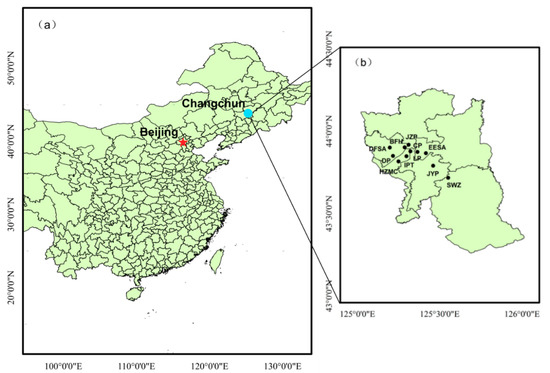 Changchun is located in the mid-latitude zone of the Northern Hemisphere, the hinterland of the Northeast Plain of China (Figure 1a). A total of 10 air quality monitoring stations were located in different districts of Changchun (Figure 1b). Nine of the 10 sites are located in the built-up area of Changchun: Daishan Park (DP), High-Tech Zone Management Committee (HZMC), Economic Development Zone Environment Sanitary Administration (EESA), Jingyue Park (JYP), Bus Factory Hospital (BFH), Labour Park (LP), Children’s Park (CP), Institute of Posts and Telecommunications (IPT), Junzilan Park (JZP), and one clean control station named Shuaiwanzi (SWZ), which is located in the Shuangyang district of Changchun. Table 1 shows the details of the above sampling stations.