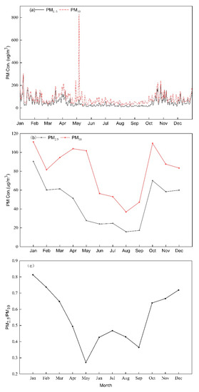 Temporal variations in (a) daily and (b) monthly mean PM2.5 and PM10 mass concentrations, and (c) PM2.5/PM10 monthly averages in Changchun in 2017.
