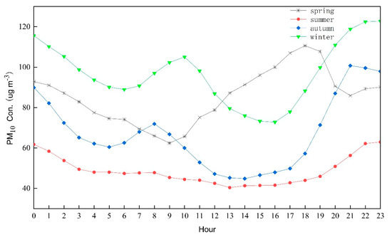 The pattern of diurnal variation in PM10 concentration was similar to PM2.5, as shown in Figure 4, which shows a bimodal pattern except spring. The first peak occurred in 08:00–10:00 CST and the secondary peak occurred in 21:00–23:00 CST. The minimum of PM10 concentration in a day was found in 13:00–15:00 CST because the strong thermal turbulence within the boundary layer in the afternoon favored the emission and vertical transport of dust particles [42]. In spring, PM10 concentrations remained high for most of the day. Sandstorm activity is more frequent in spring of Changchun, which increases the soil dust concentration. With the influence of inversion weather in spring, pollutants gather in the near-surface layer, which results in PM10 concentration increasing.