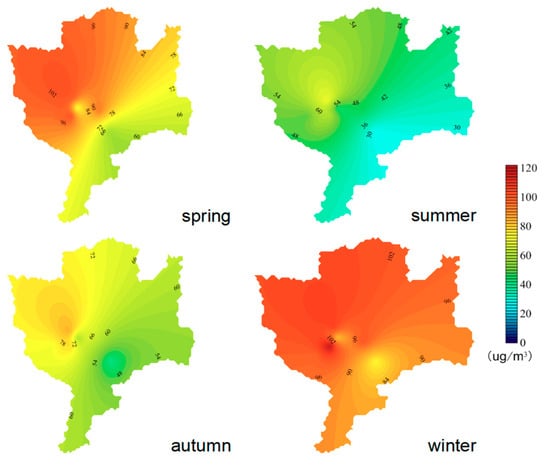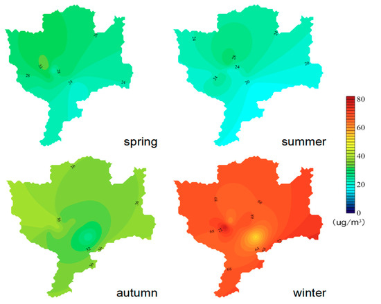 Spatial distribution of seasonal average concentrations of PM2.5.