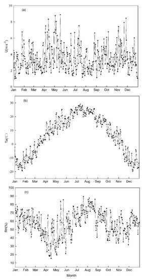 Temporal variations in daily mean (a) wind speed, (b) temperature, (c) relative humidity during 2017 in Changchun.