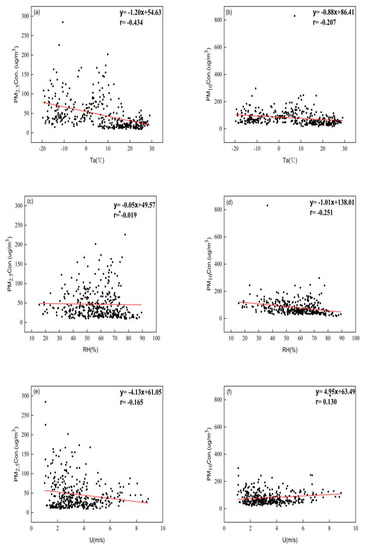 The relationship between PM2.5 concentrations and meteorological conditions (a) temperature, (b) temperature, (c) relative humidity, (d) relative humidity, (e) wind speed and the relationship between PM10 concentrations and meteorological conditions, (f) wind speed.