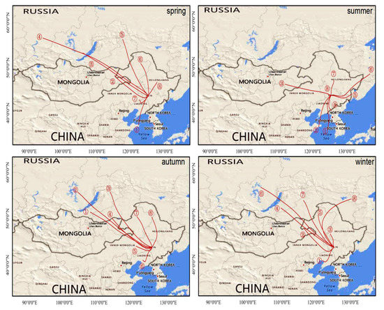 The backward trajectories of Changchun in 2017 were clustered according to seasons and the trajectories of each season were clustered into eight categories, as shown in Figure 9. Based on the backward track clustering results, the length of each track and the corresponding PM2.5 and PM10 concentrations (Table 4) were calculated to analyze the influence of each track on the PM of four seasons in Changchun.
