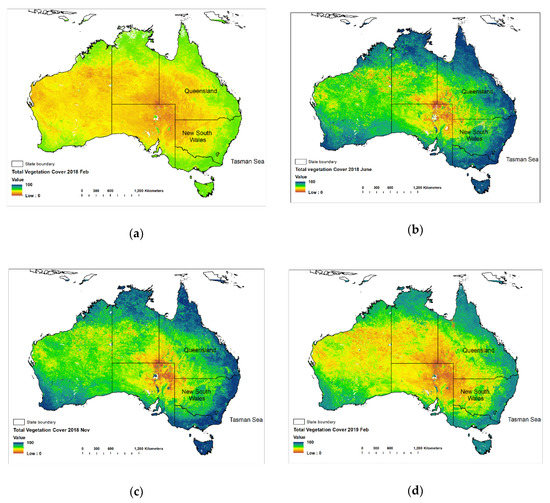 Total vegetation cover (%) for Australia in February 2018 (a), June 2018 (b), November 2018 (c) and February 2019 (d) (source: http://www-data.wron.csiro.au/remotesensing/MODIS/products/public/v310/australia/monthly/cover/).