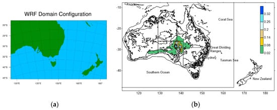 As for the dust model in the WRF-Chem model, there are limitations to the current WRF-Chem dust schemes based on topographic soil erodibility, which is confined mostly to the central Australian arid region. Rather than static erodibility, defined as soil erosion efficiency under a given meteorological forcing (i.e., wind speed), soil erodibility changes dynamically depending on the local environmental conditions, including land use, land cover type, and soil moisture [57]. In our study, soil moisture was provided by WRF-Chem meteorological component. Observation and satellite data such as MODIS have been used to calibrate this dynamic erodibility in the dust source region. However, land use and land cover (or green fraction) are based on static maps. Agricultural areas, such as the western Riverina and Mallee regions in the border area between New South Wales and Victoria, are not properly accounted for in the topographic soil erodibility map. The Riverina and Mallee regions have also been identified as dust sources [17,58,59] when using the rainfall data from the Australian Bureau of Meteorology (BOM) and land cover data derived from MODIS data to account for seasonal changes in soil erodibility and dust emission in order to study the dust climatology over a ten-year period in western New South Wales (NSW), Australia.