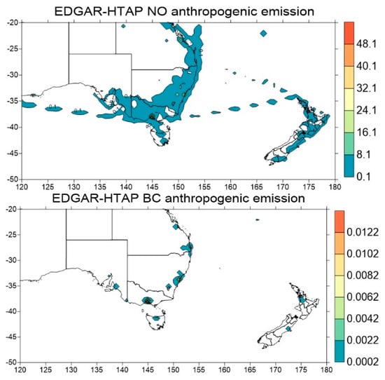 The biogenic and anthropogenic emission data for WRF-Chem input used in this study are the MEGAN (Model of Emissions of Gases and Aerosols from Nature) and the global 2005 anthropogenic EDGAR (Emission Database for Global Atmospheric Research) version 4 compiled for the Task Force on Hemispheric Transport of Air Pollution (TF-HTAP), which has emission sources including land-based and shipping transport at 1° × 1° resolution. The EDGAR-HTAP emission data includes fine particulate matter PM10 and PM2.5, carbonaceous speciation Black Carbon (BC) and Organic Carbon (OC), ozone precursor gases such as Carbon Monoxide (CO), Nitrogen Oxides (NOx), Non-Methane Volatile Organic Compounds (NMVOC), acidifying gases such as Ammonia (NH3), Nitrogen oxides (NOx) and Sulphur Dioxide (SO2) and the greenhouse gases CO2, Methane (CH4) and Nitrous Oxides (N2O). Figure 3 shows EDGAR_HTAP anthropogenic emission of NO and BC in the modelling domain.