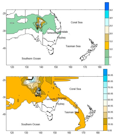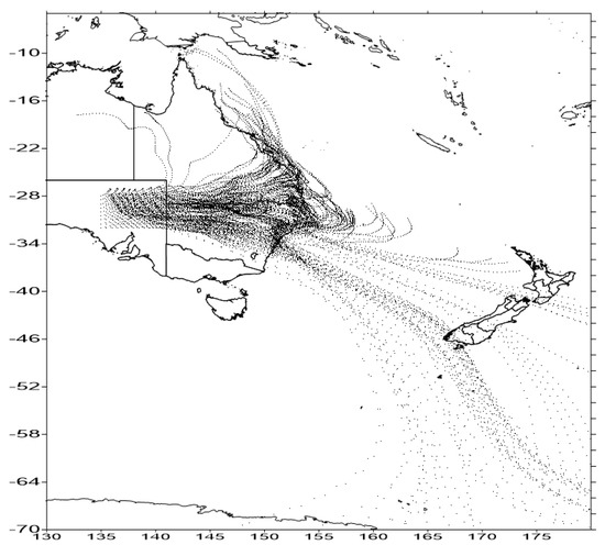 O’Loingsigh et al. 2017 [10], in their study of the sources and pathways of dust during the Australian “Millennium Drought” decade (late 1990s to mid-2010) using trajectory analysis, showed that dust storm events mostly occurred in the austral spring and summer. Dust transport from the centre of the continent to the Australian east coast is typically induced by the cold front systems from the Southern Ocean. In general, the dust is transport by three wind systems, as seen from south to north on the Australian east coast: the Southern Dust Path, below 35° S, due to prefrontal northerlies carrying dust to the south coast of Victoria; the Eastern Dust Path (35° S to 25° S, from Canberra, Sydney to Brisbane) due to the frontal westerlies; and the North East Dust Path (25° S to 20° S) due to the postfrontal south westerlies [10].