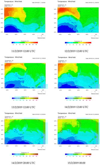 The predicted temperature and surface wind field from WRF-Chem across the domain show a consistent wind pattern from south westerly on 11–12 February 2019 12:00 UTC to easterly on 13 February 2019 12:00 UTC and 14 February 2019 12:00 UTC, with a cold front in the Southern Ocean, as shown in Figure 5.