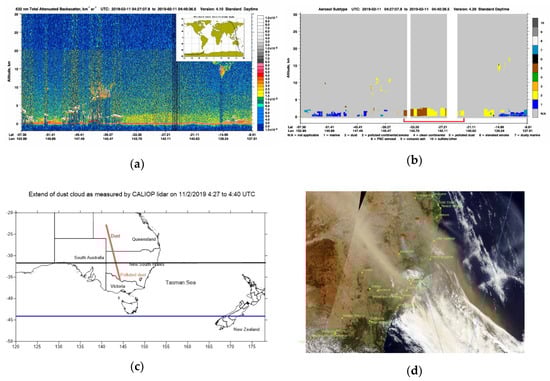 Extent of the dust cloud as detected by satellites: (a) LiDAR 532 nm total attenuated backscatter vertical structure on 11 February 2019 from 4:27 to 4:40 UTC with CALIPSO satellite path above central Australia; (b) aerosol subtype vertical profile as derived from CALIOP measurements. (c) Extent of the dust cloud (red line) as measured by CALIPSO satellite on 11 February 2019 4:27 to 4:40 UTC and cross sections of predicted PM10 and wind profile (black and blue lines). (d) MODIS Terra satellite image of the dust event and wildfires in the New England area on 13 February 2019 and the locations of the main towns and cities in NSW.