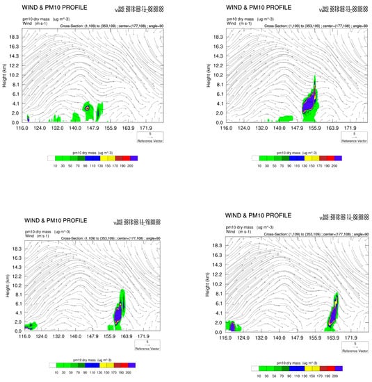 The predicted vertical PM10 and wind profiles allow us to understand the process of dispersion and evolution of the dust plumes from emission sources across the modelling domain. The PM10 and wind profiles across the −31.73° latitude horizontal line (black line) in Figure 6c at different times are shown in Figure 7. The south westerly wind carried the dust from the modelled sources in central Australia; the dust plume crossed the Great Dividing Range on north westerly winds (Figure 7a) over the coast to the Tasman Sea on south westerly winds (Figure 7b–d). The vertical wind (w-component) is small compared to the u- and v-components above this cross-section line.