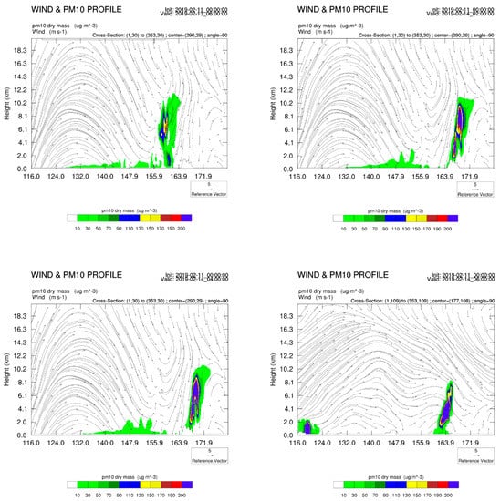 Predicted PM10 and wind profile along the latitude −44.10° on 13 February 2019 06:00, 14 February 2018 02:00, 14 February 2019 04:00, and 14 February 2019 06:00 UTC. The vertical topographic outline at the bottom of the graphs shows the Tasman Sea and the South Island of New Zealand.