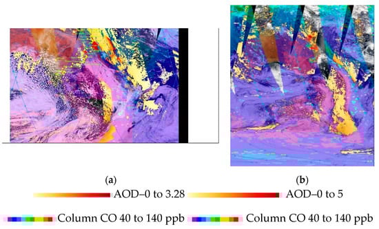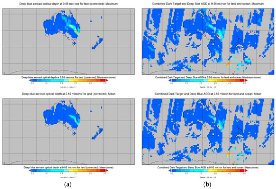 (a) Maximum and mean AOD Deep Blue Terra MOD08-D3 for 13 February 2019 and (b) combined maximum and mean AOD of Deep Blue (land) and Dark Target (ocean) from Terra MOD08-D3 for 13 February 2019.