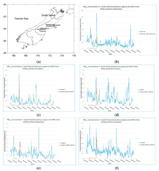 (a) Monitoring stations in the Canterbury area of the South Island, New Zealand, for 14 February 2019. (b–f) Predicted PM10 from WRF-Chem with AFWA dust scheme (red line), FINN fire emission and MOZART and GOCART chemistry mechanism and observed PM10 (blue line) at Woolston, Geraldine, Timaru, Rangiora and Kaiapoi.