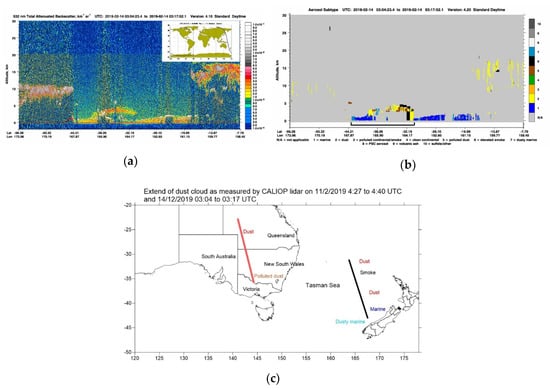 As shown in Figure 13a,b, the CALIOP LiDAR on the CALIPSO satellite, above the coast of eastern Australia on 13 February 2019, showed dust and smoke aerosol layers situated above the dusty marine and marine aerosol layers. The dust and smoke aerosol layers (from approximately 2 km to 5 km) above the dust-contaminated marine and fresh marine aerosol layers below (from just above sea level up to a height of 2 km) extend to about 1400 km long.