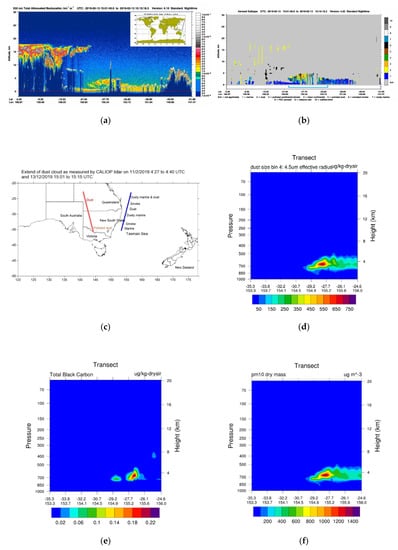 (a) LiDAR 532 nm total attenuated backscatter vertical structure on 13 February 2019 from 15:01 to 15:15 UTC with CALIPSO satellite path (inset) on 13 February 2019 above the coast of eastern Australia. (b) Aerosol subtype vertical profile as derived from CALIOP measurements. (c) Extent of dust clouds as measured by the CALIPSO satellite on 11 February 2019 (red line) and on 13 February 2019 (blue line). The labels correspond to aerosol types at the location indicated. (d–f) Transects of WRF-Chem predicted dust of size bin 4, total black carbon and PM10 on 13 February 2019 15:00 UTC along the same CALIPSO satellite path.