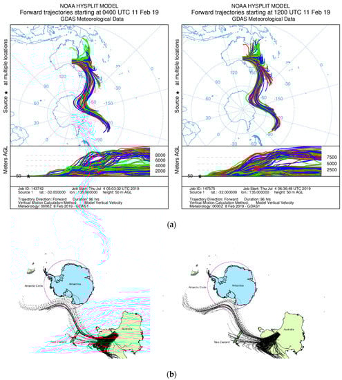 Li et al. 2008 [56] studied the distribution, transport and deposition of dust in the Southern Ocean and Antarctica from dust sources in South America, Australia, and the Northern Hemisphere using GFDL Atmospheric General Circulation Model AM2 for a 20-year period (1999–1998). They found that the majority of dust transported to the Southern Ocean came from Australia (120 Tg/year), followed by Patagonia in South America (38 Tg/year) and inter-hemispheric transport from the Northern Hemisphere (31 Tg/year). A small fraction of this dust is deposited in the Southern Ocean and Antarctica (7 Tg/year). Our study of the February 2019 dust storm in eastern Australia shows that dust from this event was transported to Antarctica.