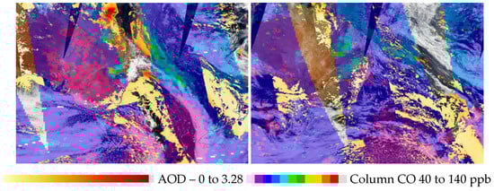 The progress of the dust and smoke plumes as viewed from above can also be seen in the AOD spatial pattern over time as revealed by the MODIS Terra/Aqua MO08-D3 and MYD08-E3 satellite products. The AOD from the Deep Blue algorithm for bright targets on land (such as deserts), and the Dark Target algorithm for dark targets (such as ocean) can be combined. These AODs are shown in Figure 9 for the 13 February 2019 from the Terra MOD08-D3 product and in Figure A3 of the Appendix for the period from 10 to 17 February 2019 from the Aqua MYD08-E3 product. The MYD08-E3 product provides the maximum and average of daily AOD for the 7-day period starting from 10 and ending on 17 February 2019, and shows the spatial pattern of AOD for this period to be a result of the dust transported in the February 2019 dust storm.