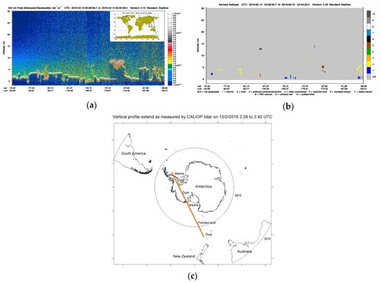 (a) LiDAR 532 nm total attenuated backscatter vertical structure on 14 February 2019 from 03:04 to 03:17 UTC with CALIPSO satellite path (inset) above the Tasman Sea near New Zealand. (b) Aerosol subtype vertical profile as derived from CALIOP measurements with dust as yellow and smoke as black. (c) Extent of aerosol layer clouds as measured by CALIPSO satellite on 11 February 2019 (red line) and on 14 February 2019 (black line). The labels correspond to aerosol types at the location indicated.