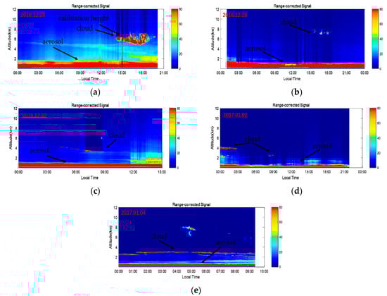 Vertical profile of range-corrected signal: (a) December 28 00:00–20:00; (b) December 29, 01:05–23:55; (c) December 30 00:00–10:40 and 11:00–14:55; (d) January 2 00:00–22:00; (e) January 4 00:00–9:20.