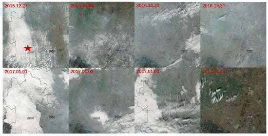 PM2.5, PM10, SO2, NO2, CO, and O3 monitoring data: The inspection period was from 26 December 2016 to 5 January 2017. The real-time variation data of the mass concentration of PM2.5, PM10, SO2, NO2, CO, and O3 are provided by the Shouxian National Climatological Observatory at 32°33’ N, 116°47’ E. Meteorological element data: The monitoring data on the ground were sourced from the Weather Underground website (https://www.wunderground.com/weather/cn/huainan/). The collected meteorological elements include the temperature, relative humidity, wind speed and direction, and daily cumulative precipitation.