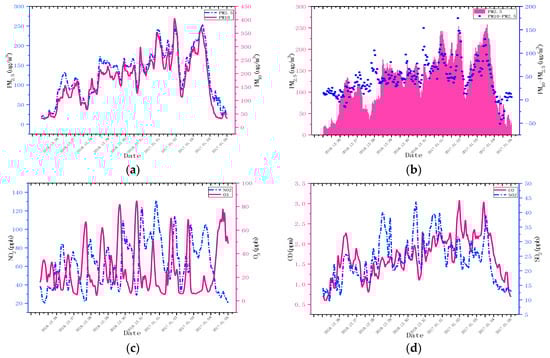 In order to further analyze the relationship between the particle concentration and polluted gas in the process of hazy-foggy composite pollution, this paper analyzes the data by time series plotting, as shown in Figure 4.