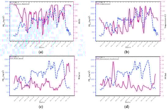 Variations of PM2.5 concentration with meteorological parameters: (a) Relative humidity; (b) temperature; (c) wind speed; (d) horizontal visibility.