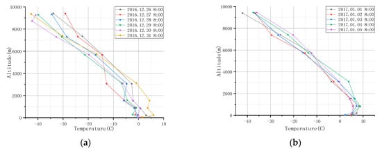The vertical temperature profile: (a) December 26, 2016 to December 31, 2016; (b) January 1, 2017 to January 5, 2017.