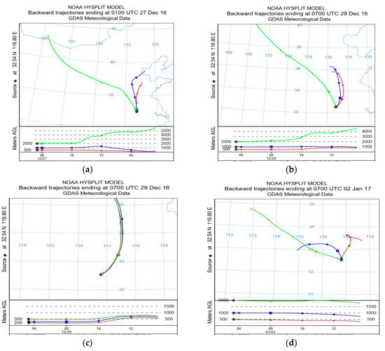 24-h backward trajectories: (a) 9:00 on 27 December (local time); (b) 15:00 on 29 December (local time); (c) 15:00 on 29 December (local time); (d) 15:00 on 2 January (local time).