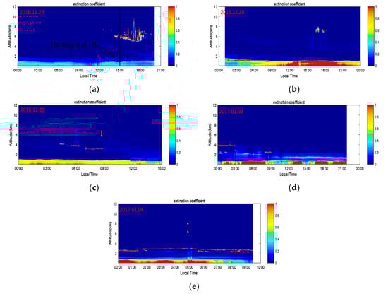 Vertical profile of particle extinction: (a) December 28 00:00–20:00; (b) December 29, 01:05–23:55; (c) December 30 00:00–10:40 and 11:00–14:55; (d) January 2 00:00–22:00; (e) January 4 00:00–9:20.