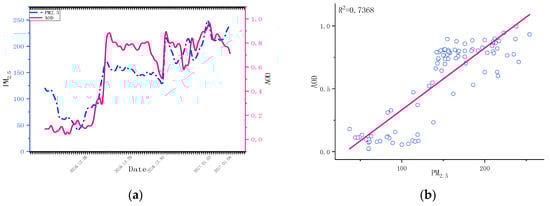 Relationship between particulate matter and the aerosol optical depth (AOD): (a) Variation in AOD and the concentration of particulate matter; (b) correlation between the concentration of particulate matter and AOD.