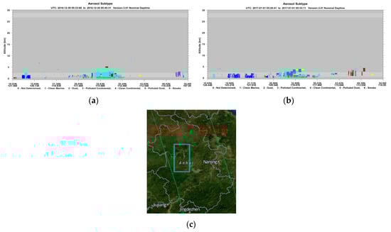 The vertical continuous detection of CALIPSO: (a) Aerosol subtype on December 30; (b) aerosol subtype on January 1; (c) the CALIPSO orbits with green lines and the Huainan region with a blue box.