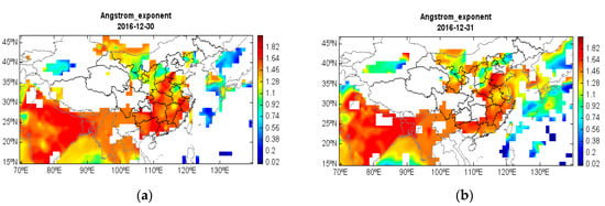 Figure 11 shows the VIIRS deep blue AOD at 550 nm in Huainan. Due to the cloud cover, the AOD values of five days in this weather process were selected, and the AOD values showed obvious spatial gradient, which were larger in the north and smaller in the south of Huainan. The values of AOD over the Huainan area were 0.056, 0.504, 0.571, and 0.728. During the occurrence of foggy-hazy weather, the increasing AOD value represents an increasing amount of aerosol particle aggregation, which is basically consistent with the ground-based LIDAR observation. Figure 12 shows the VIIRS angstrom exponent (AE) at 550 nm in Huainan. The values of AE over the Huainan area were 1.481 and 1.30. It can be seen that on December 30 and 31, the pollutants are mainly fine-mode particles, indicating that the main pollutants are from man-made emissions. Due to the limited amount of AE data, it is not possible to judge whether the external air mass is mixed with the local man-made emissions, resulting in the change of the pollutant particle size.